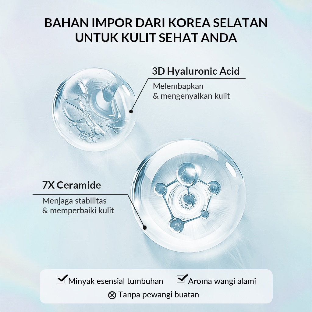 BAHAN IMPOR DARI KOREA SELATAN,UNTUK KULIT SEHAT ANDA 7X Ceramide,Menjaga stabilitas & memperbaiki kulit 3D Hyaluronic Acid,Melembapkan & mengenyalkan kulit