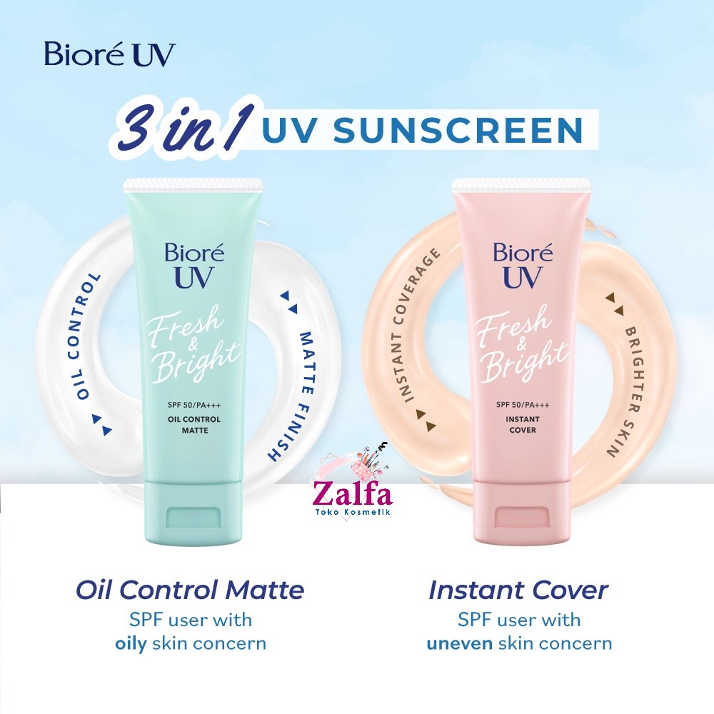 Biore UV Fresh & Bright SPF 50 PA+++ - Oil Control Matte tidak hanya memberikan perlindungan terhadap sinar UV, tetapi juga mengurangi kulit tampak berminyak sehingga dapat menjaga make up tahan lama. Kulit tampak cerah seketika. - Insant Cover tidak hanya memberikan perlindungan terhadap sinar UV, tetapi juga menyamarkan warna kulit yang tidak rata dan noda hitam di wajah secara instan. Kulit terlindungi, tak perlu khawatir kulit belang.