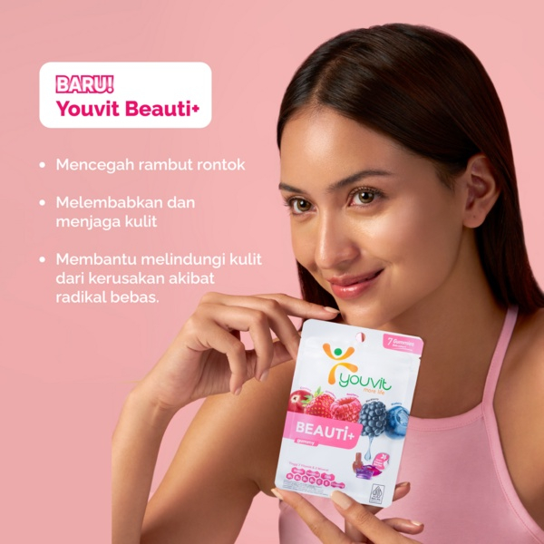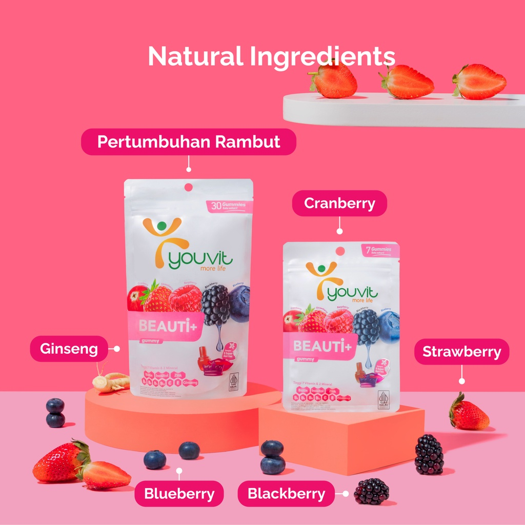 Youvit Beauti+ dengan formulasi TERBARU merupakan vitamin gummy dengan bahan alami yang dapat membantu menangani masalah rambut dan kulit dari dalam. Kombinasi kandungan Inositol, Ginseng, Biotin, dan berbagai multivitamin di dalamnya dapat membantu mengurangi rambut rontok, menstimulasi pertumbuhan rambut, dan membantu membuat kulit nampak lebih sehat (untuk usia 16 tahun ke atas) - 7 Vitamin & 2 Mineral - Kaya vitamin C, E dan Zink - Mengandung Ginseng dan Mixberries Juice alami - 1 gummy setiap hari seimbang