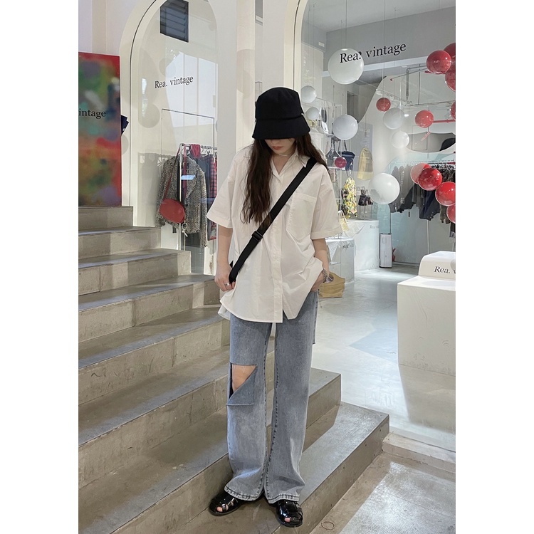 Detail Biru Highwaist Loose Premium Robek Serbaguna Celana Jeans Wanita