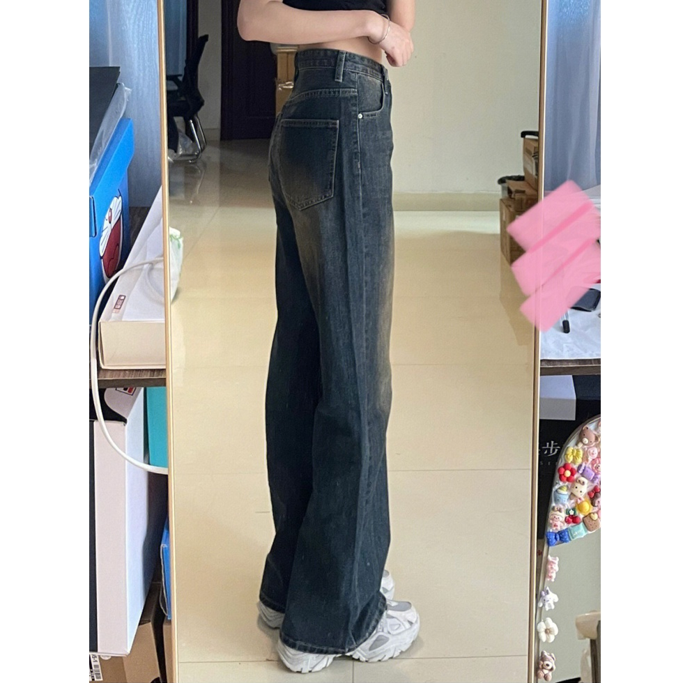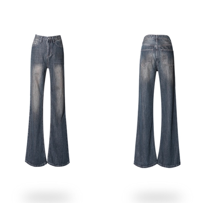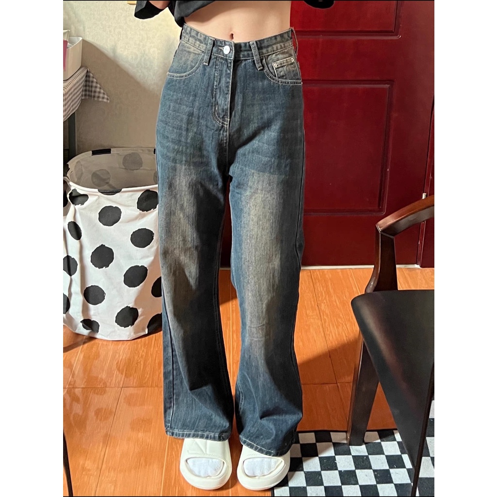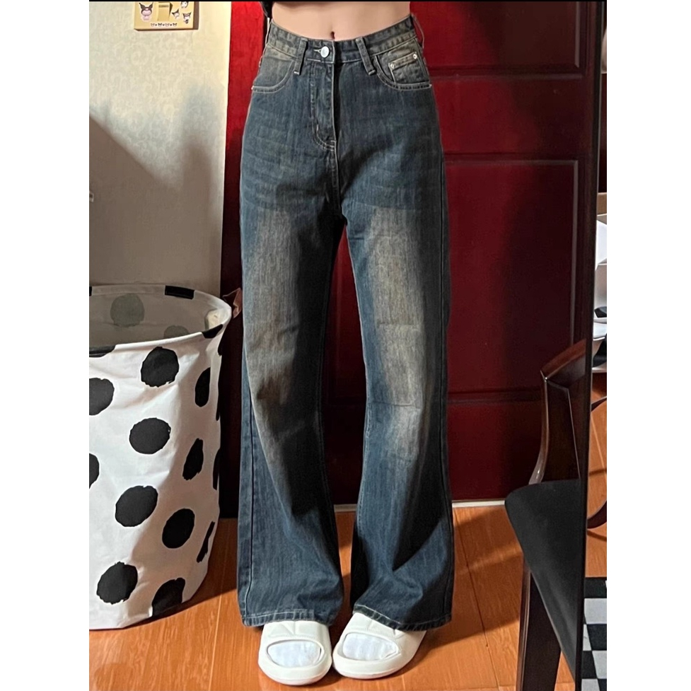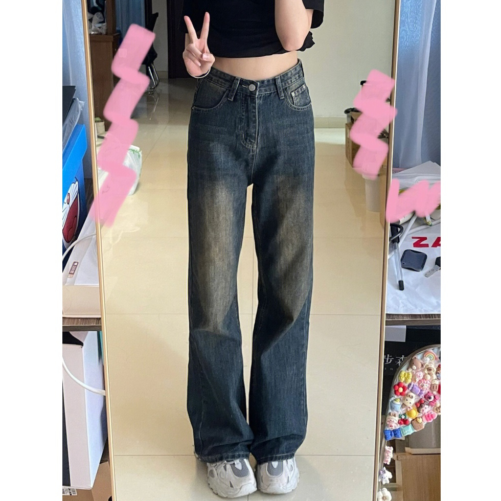Detail Biru Retro Highwaist Celana Cutbray Jeans Wanita Loose Kekinian