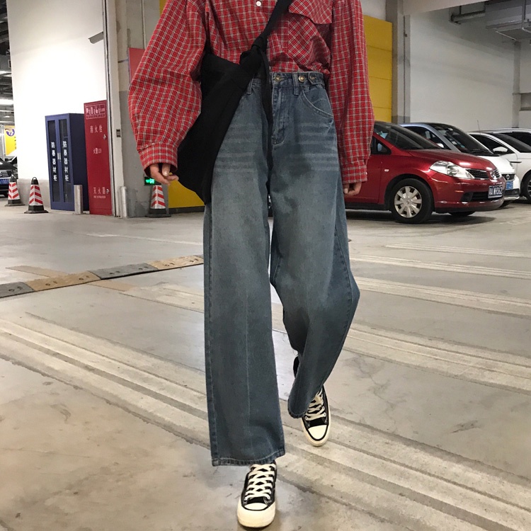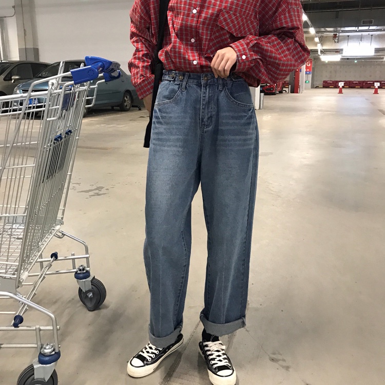 Detail Biru retro new celana jeans panjang wanita high waist kulot impor original