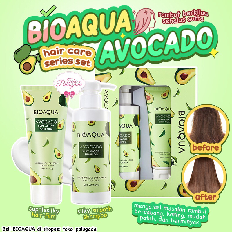 BIOAQUA Avocado Hair Care Series Set isinya 1 pcs Avocado Silky Smooth Shampoo 200ml 1 pcs SuppleSilky Hair Film 100g (masker rambut)