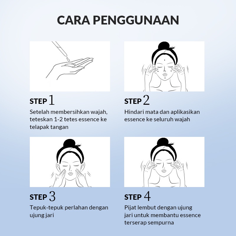 Setelah membersihkan wajah di pagi dan malam hari, ambil essence secukupnya dan oleskan secara merata ke wajah dan leher, pijat dengan lembut sampai terserap sempurna.