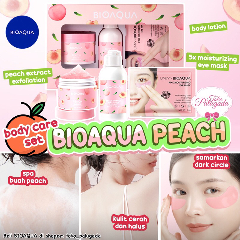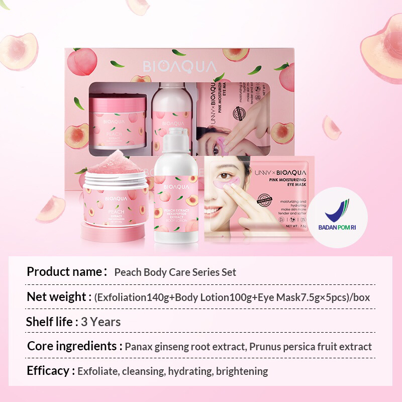 BIOAQUA Peach Body Care Series Set isinya 1 pcs Peach Extract Fruit Exfoliation 140g 1 pcs Peach Extract Hexapeptide Extract Body Lotion 100gr 5 pcs Pink Moisturizing Eye Mask 7.5g