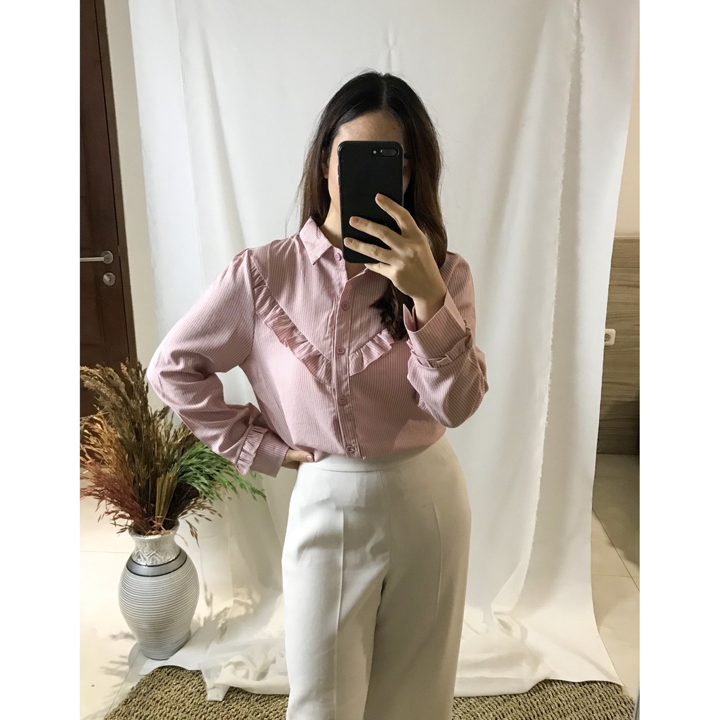CELESTA TOP Kemeja kekinian yang cantik, cocok banget buat ke kantor atau meeting dengan client. Padukan dengan celana kullot panjang penampilan langsung kerennn.