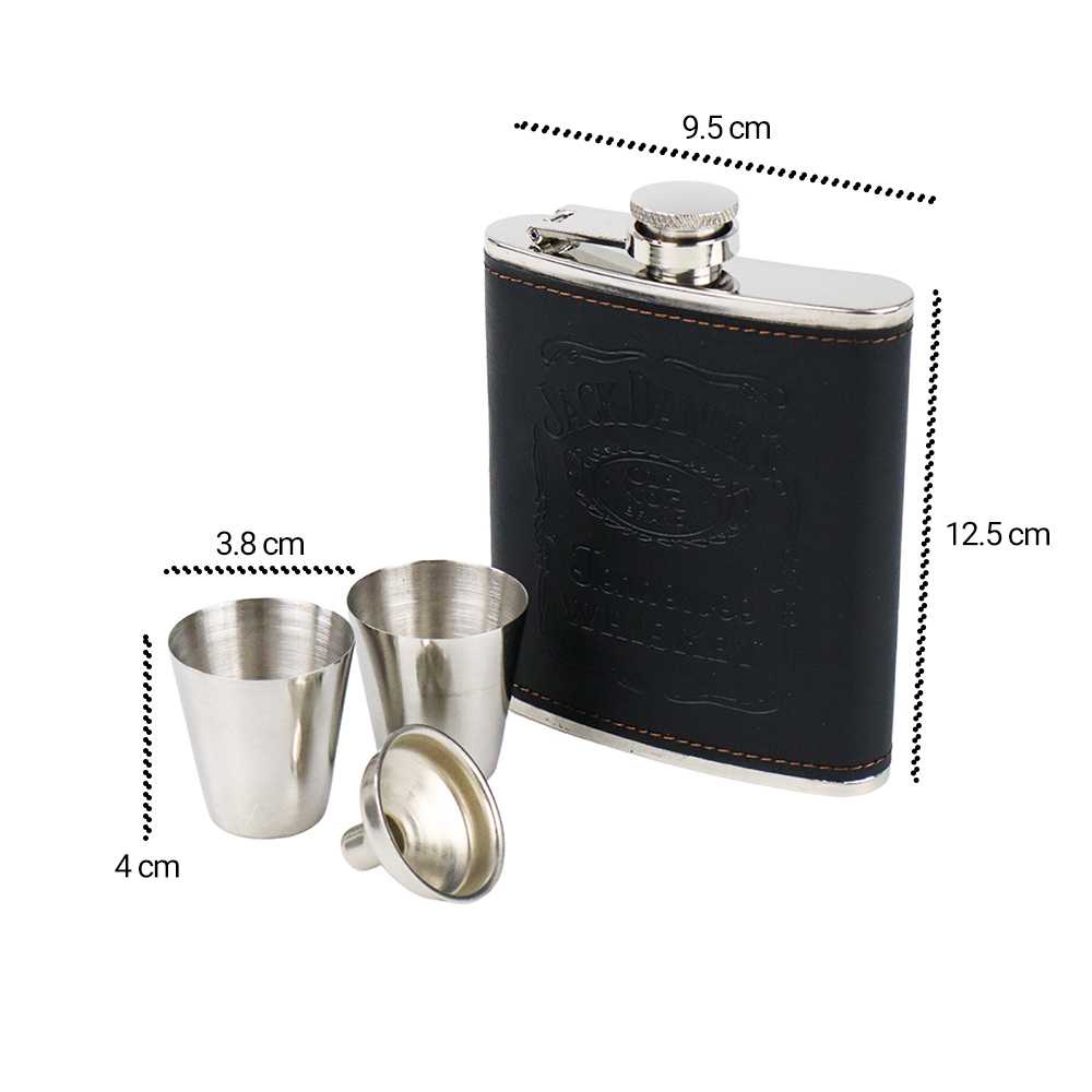Material Stainless Steel dan Kulit Sintetis Dimensi Size Botol: 12.5 x 9.5 x 2.2 cm Size Gelas: 3.8 x 3.8 x 4 cm Kapasitas Botol: 7 Oz (Sekitar 207 ml)