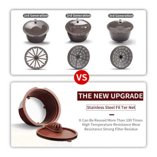 Kapsul ini berguna untuk menampung bubuk kopi pada mesin pembuat kopi Dolce Gusto. Anda dapat menggunakan kapsul ini berulang-ulang, tidak seperti kapsul bawaan yang hanya bisa digunakan satu kali saja. Fitur Kapsul Kopi Kapsul ini berguna untuk menampung bubuk kopi yang digunakan oleh mesin pembuat kopi Dolce Gusto sehingga Anda bisa mendapatkan hasil kopi yang nikmat. Material Food Grade Plastik Kapsul kopi ini terbuat dari bahan plastik PP food grade sehingga aman untuk digunakan. Sementara bagian filternya terbuat full dari stainless steel yang aman dari karat dan jauh lebih awet untuk digunakan berkali-kali. Peningkatan Versi Berbeda dari generasi terdahulu, versi upgrade ini menggunakan saringan yang lebih baik daripada versi sebelumnya dan cocok untuk penggunanan jangka panjang.
