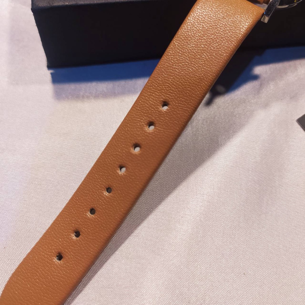 Wide Strap berbahan kulit dengan finishing glossy, secara keseluruhan jam ini memancarkan wibawa misterius yang berkelas