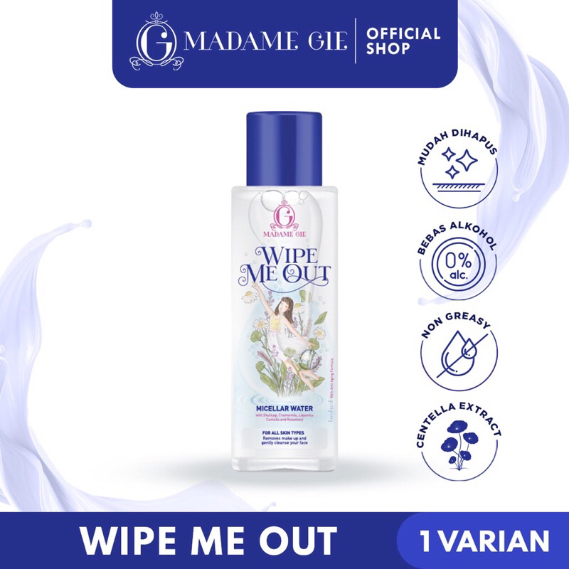 Madame Gie Wipe Me Out Micellar Water berfungsi untuk menghapus dan membersihkan makeup waterproof, dengan formula lembut yang di lengkapi dengan kandungan Skullcap, Chamomile, Liquorice Centella and Rosemary yang berfungsi melembabkan kulit serta di lengkapi dengan kandungan knotweed yang aman untuk semua jenis kulit