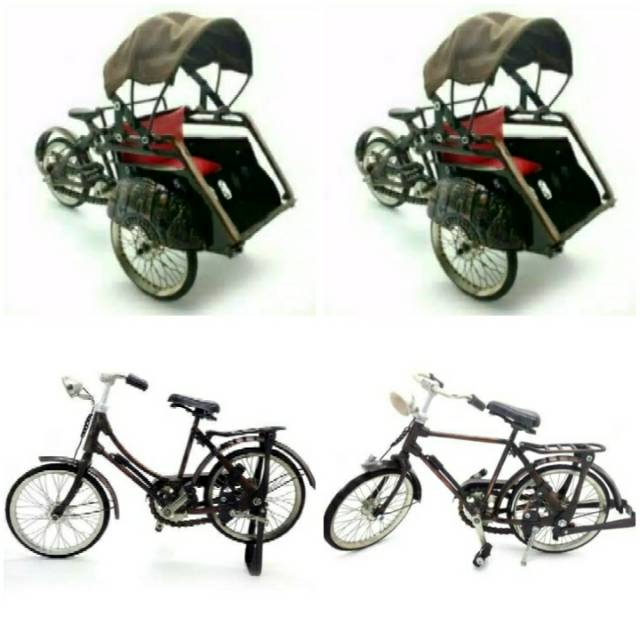 Paket Hemat 2 Becak Jawa & 2 Sepeda Ontel Isi: *2 Becak Jawa Spesifikasi: - Buatan: Pengrajin Logam Yogyakarta - Ukuran (P x L x T): 28 x 21 x 12 cm Becak bisa digerakkan seperti becak aslinya, detail gear & rantai asli, jadi pedal bisa dikayuh Roda bisa berputar