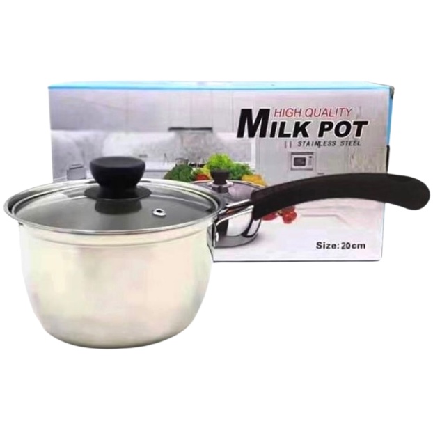 Terbuat dari Bahan Stainless steel. Handle terbuat dari bahan plastik yang berfungsi sebagai isolator panas sehingga gagang tetap tidak panas walau lama digunakan. Panci Susu sangat cocok untuk memasak air, indomie, Kukus dll.
