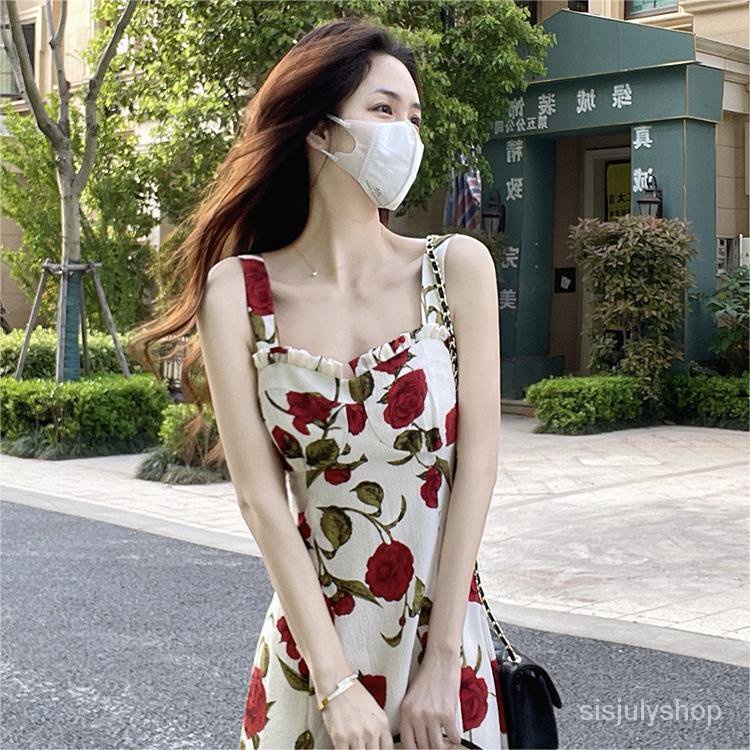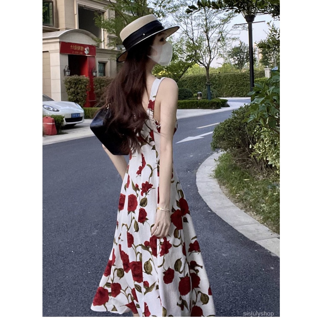 Detail [✅BISA COD] #Sisjuly# Gaun halter bunga merah Prancis wanita dengan temperamen baru gaun panjang ten