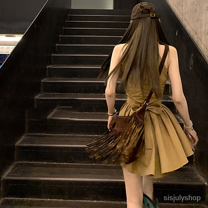 Detail [✅BISA COD] #Sisjuly# Gaun kemeja kerah polo wanita dengan gaun busur ramping pinggang retro baru