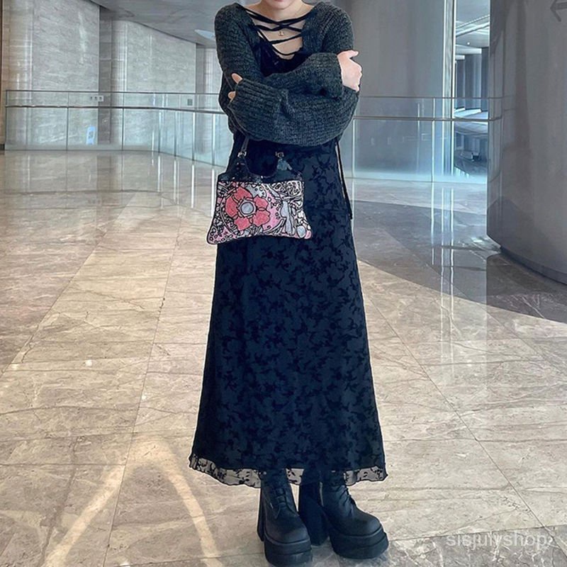 Detail [✅BISA COD] #Sisjuly# Gaun Y2K Wanita / Gaun Kamisol Bunga Jala / Gaun Midi Ramping Wanita