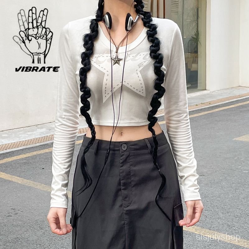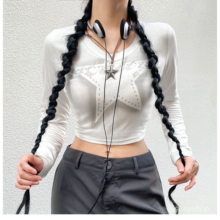 Detail [✅BISA COD] #Sisjuly# Kaos Lengan Panjang Y2K Wanita / Kaos Lengan Panjang Cetak Bintang Vintage Ame