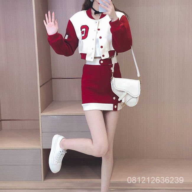 [✅BISA COD] #Sisjuly# Merah Meriah Bisbol Suit Wanita Musim Semi Kecil Tinggi Olahraga Dua Setelan Jas