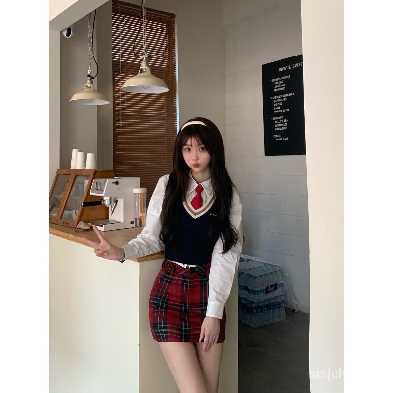 [✅BISA COD] #Sisjuly# Setelan Wanita / Rompi pendek berleher V berwarna biru tua + kemeja putih + ro