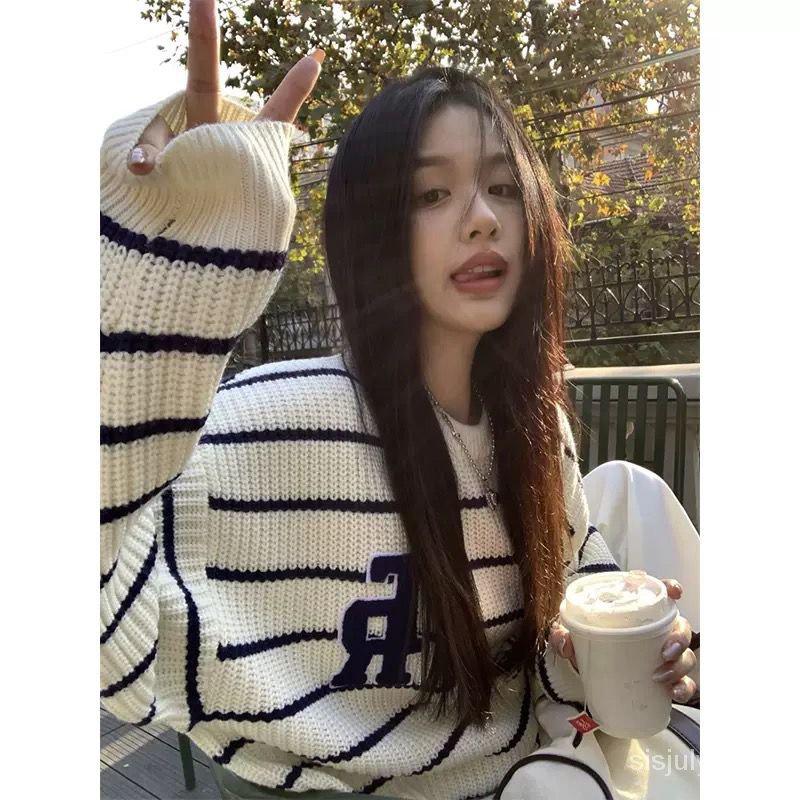 Pakaian Wanita > Sweater & Cardigan > [✅BISA COD] #Sisjuly# Wanita Rajut Sweater Wanita Musim Dingin Baru Retro Jepang Bergaris Huruf Longgar Pullover Pakaian Luar