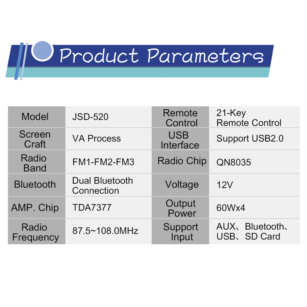 Dengan harga yang begitu terjangkau, tape audio mobil multifungsi ini dilengkapi sejumlah fitur yang sangat berguna bagi pemilik mobil. Mulai dari koneksi bluetooth, FM radio, support USB flashdisk dan SD Card, USB charging, remote control function, dan masih banyak lagi.FeaturesIntelligent Bluetooth Call