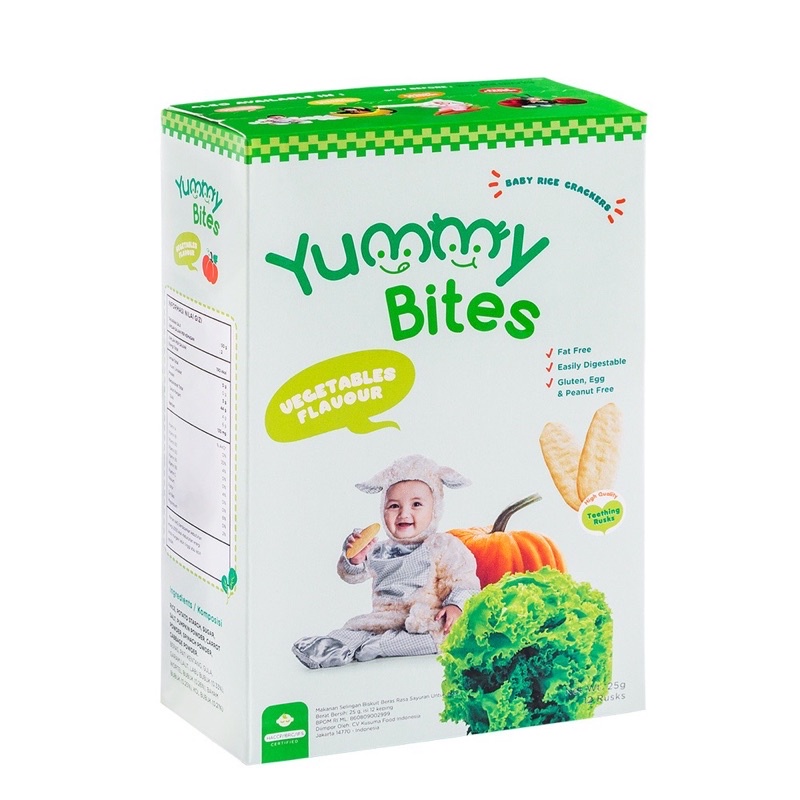 Yummy Bites Baby Rice Crackers adalah snack bayi yang terbuat dari beras berkualitas alami. Bebas lemak, mudah dicerna, bebas gluten, telur, kacang sehingga aman untuk bayi alergi. Makanan selingan untuk bayi usia 6 bulan ke atas. Berbentuk memanjang, sehingga memudahkan bayi untuk menggenggam dan belajar makan sendiri. Dapat dikombinasikan dengan puree buah segar. Yummy bites dibuat aman untuk bayi yang sedang tumbuh gigi, mudah larut di mulut. Perkenalkan Yummy Bites Cracker pada bayi Bunda sebagai makanan padat yang lezat dan nikmati pengalaman baru yang menyenangkan di setiap gigitannya.