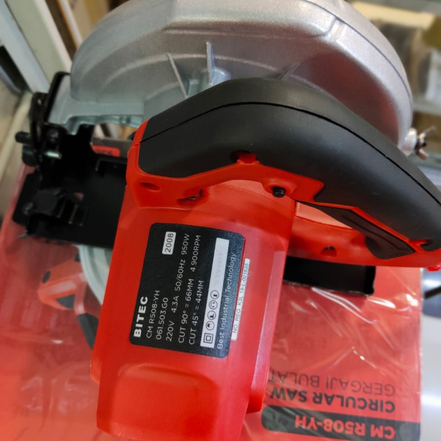 Merk : Bitec Type : CM R508-YH Ukuran : 7¼ inch (187 mm) Input Power : 950 Watt No Load Speed : 4.900 RPM Bore Size : 20 mm Cutting Capacity 90° : 66 mm Cutting Capacity 45° : 44 mm