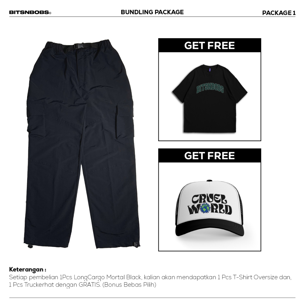 Setiap pembelian Longcargo Mortal Black, kalian akan mendapatkan bonus : • T-Shirt Oversize (Bebas Pilih) • Truckerhat (Bebas Pilih)