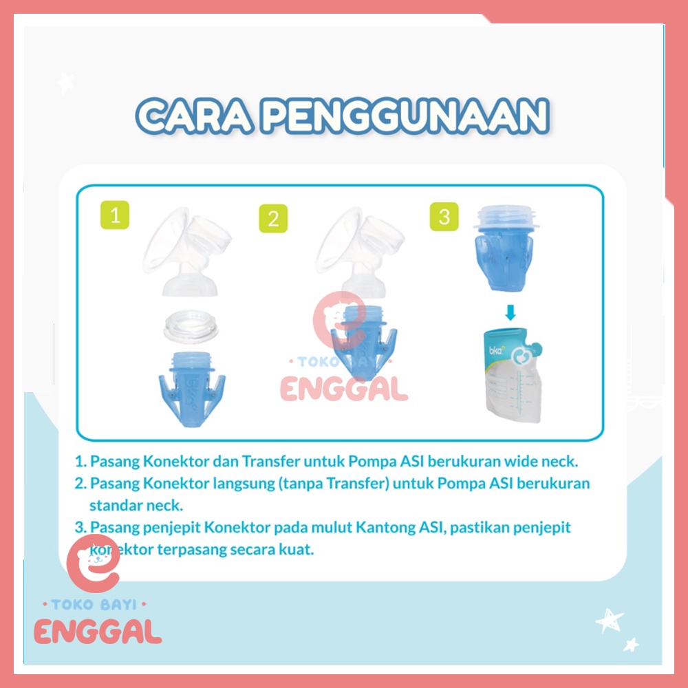 Cara penggunaan : 1. Pasang Konektor dan Transfer pada pompa berukuran Wide Neck. 2. Pasang Konektor langsung (tanpa transfer) pada pompa berukuran Standar Neck. 3. Pasang penjepit Konektor pada mulut Kantong ASI, Pastikan penjepit konektor terpasang secara kuat.