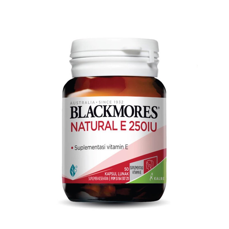 BLACKMORES NATURAL E 250 IU 50 KAPSUL Deskripsi Blackmores Natural E 250 IU merupakan sumber alami antioksidan Vitamin E yang bertahan lebih lama dalam tubuh dan 2x lebih efektif. Vitamin E juga mengurangi oksidasi dari kolesterol LDL. Blackmores Natural E 250 IU tersedia dalam kemasan botol berisi 50 kapsul. Manfaat Vitamin E bagi tubuh : 1.Berperan penting dalam menjaga kesehatan kulit, mencegah proses penuaan dini, meningkatkan elastisitas kulit, melindungi kulit dari radiasi sinar UV. 2. Meningkatkan daya tahan tubuh, mengatasi stres, meningkatkan kesuburan, meminimalkan risiko penyakit jantung koroner 3. Sebagai antioksidan, melindungi struktur sel dari kerusakan akibat radikal bebas . 4. Berperan dalam melindungi fungsi mata dan syaraf. Komposisi d-alpha-Tokoferol (vitamin E alami 250 IU) 168 mg. Dosis Dewasa: 1 kapsul sehari setelah makan, atau sesuai petunjuk dokter. Aturan Pakai Dikonsumsi setelah makan Perhatian - Mengandung natrium sulfit. - Suplemen vitamin sebaiknya tidak menggantikan diet seimbang. - Hindari pengunaan bagi anak-a;nak dibawah usia 12 tahun. Petunjuk Penyimpanan Simpan di bawah 30° C, ditempat yang kering, dan jauhkan dari paparan sinar matahari langsung.