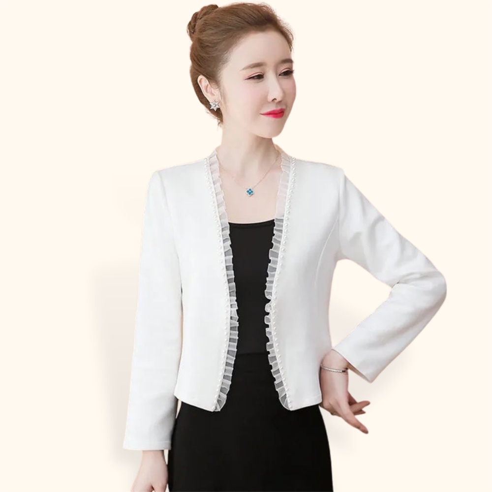 Blazer Kerja Kantor Wanita Gaya Korea variasi renda model Terbaru - XSHOP Haerin, Blazer model terbaru dari XSHOP, terbuat dari bahan scuba berkualitas, tebal tapi nyaman dipakainya. Model simpel dan elegan dengan variasi renda di bagian pinggir dan mutiara di bagian list yang di jahit dengan mesin (bukan di tempel, jadi lebih awet) cantik dan elegan, cocok untuk di pakai dalam acara formal maupun casual.