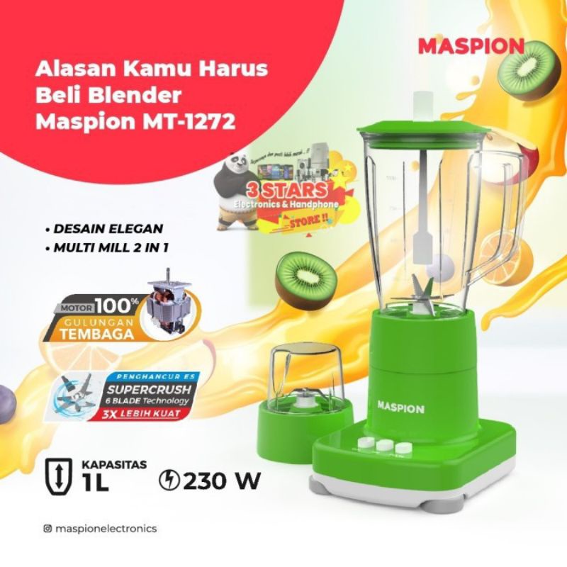 MASPION MT-1272 GL Blender Gelas 1 Liter 2in1 Maspion MT1272GL - Blender Gelas 1 Liter 2in1 230 Watt berkapasitas 1 liter serta cup dan dry mill 50 gram ini memiliki mode operasional on/off. Memudahkan gerakan dalam satu kali klik. Apalagi, daya listriknya sangat hemat, cukup 230 watt saja.