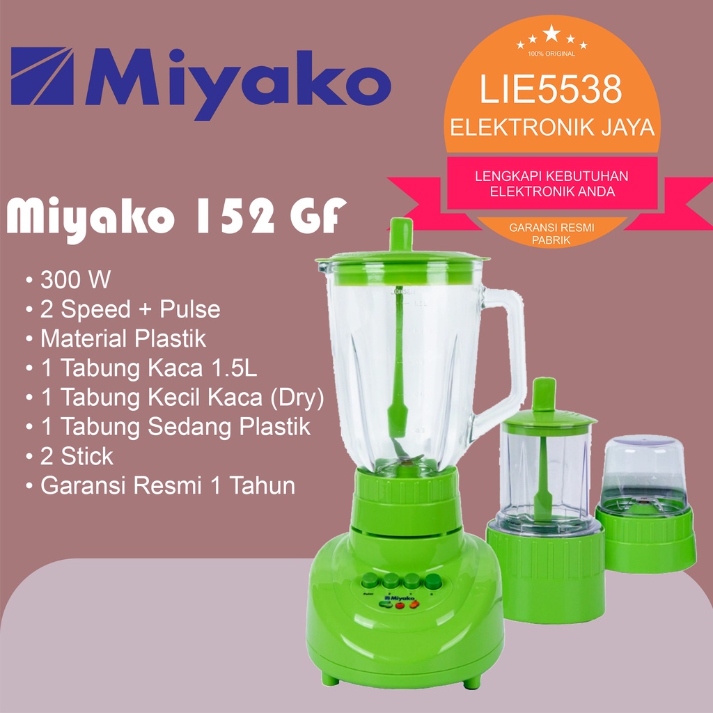 Miyako Blender Kaca BL-152 GF Hijau merupakan blender yang dirancang khusus dengan wadah kaca yang higienis dan berkualitas sehingga blender kuat dan tahan lama. Kapasitas wadah blender ini sebesar 1.5 Liter. Dilengkapi dengan 5 pilihan kecepatan sesuai dengan kebutuhan dan keinginan Anda. Dilengkapi pula dengan sebuah tombol Pulse sehingga putaran blender bisa disesuaikan dengan seberapa lama Anda memencet tombol. Blender akan mati secara otomatis bila mesin terlalu panas. Sehingga aman digunakan. Konsumsi daya listrik alat ini sebesar 300 watt.