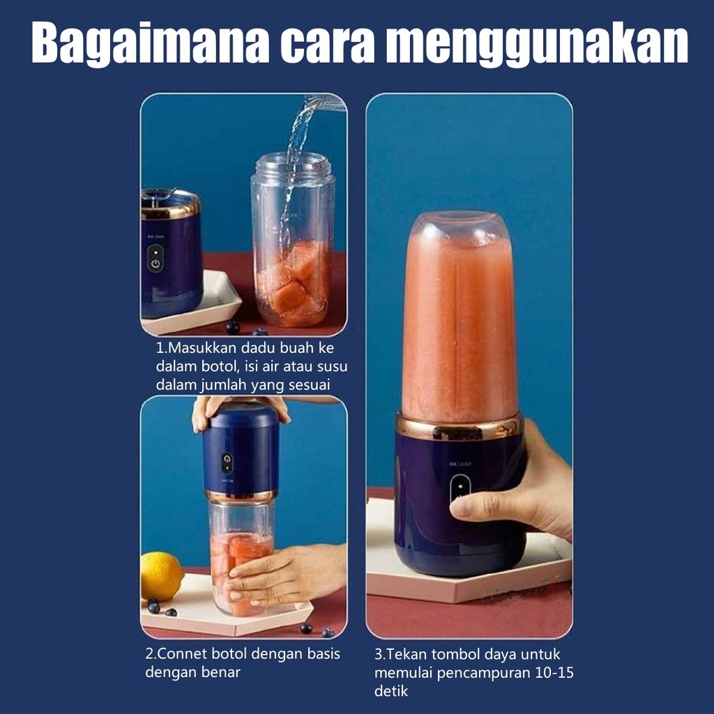 Bagaimana cara menggunakan : 1.Masukkan dadu buah ke dalam botol, isi air atau susu dalam jumlah yang sesuai 2.Connet botol dengan basis dengan benar 3.Tekan tombol daya untuk memulai pencampuran 10-15 detik 4.Secangkir jus segar siap disajikan