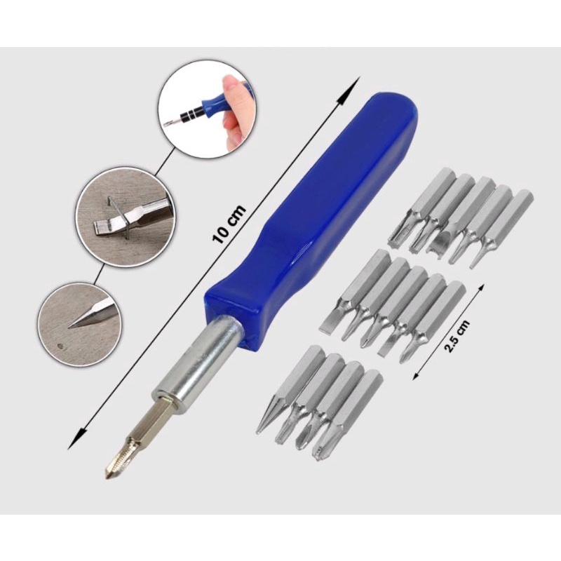 SET OBENG 16IN1 (15MATA OBENG+1GAGANG) Dimensi produk - Panjang 8.5 cm - Lebar 1 cm - Berat 80 gram - Bahan gagang : Plastik - Bahan mata Obeng : Besi Screw driver Set Set obeng dengan 15 kepala obeng + 1 pegangan ➕ Set obeng dengan 15 kepala obeng + 1 pegangan ➕ Obeng dilengkapi dengan magnet sehingga mata obeng tidak mudah jatuh ➕ Cocok untuk reparasi elektronik kecil seperti HP, mainan dll ➕ Praktis, mudah untuk dibawa kemanapun ➕ Handle obeng ergonomis agar nyaman digenggam dan tidak gampang slip ➕ Terbuat dari bahan Baja + Plastic ➕ Ukurannya 8.2 x 1 cm ➕ Warna Biru Obeng Ini dapat digunakan untuk reparasi barang / produk yang mempunyai skrup kecil seperti Ponsel, Kacamata, Laptop dan barang lainnnya Setiap Pembelian sudah termasuk Gagang obeng dan 15 mata obeng