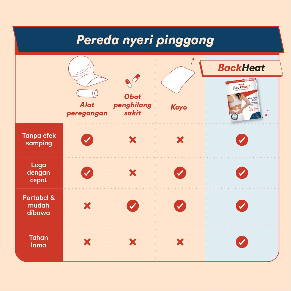 BackHeat adalah kompres penghangat/koyo atau plester pereda nyeri pinggang.