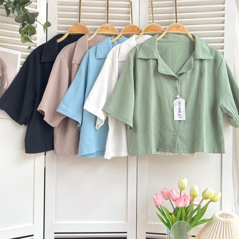 Detail Blouse Polos Wanita Korea Terbaru / Atasan Cewek 142/crop Linen kemeja crop