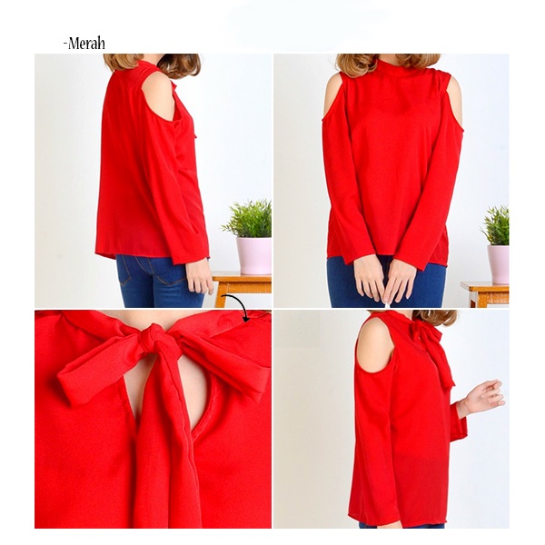 Blouse Selina Model : Cold Shoulder Warna : Merah, Broken White Bahan : Wollycrepe LD : 104 cm PJG : 65 cm ALL SIZE FIT TO XL