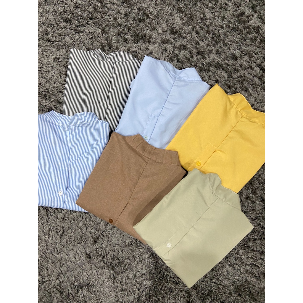 motif salur , kuning , softblue bahan katun jepang putih dan coksu bahan katun supernova lingkar dada : 100 cm panjang depan : 60 cm panjang blkg : 70 cm belakang kancing hidup