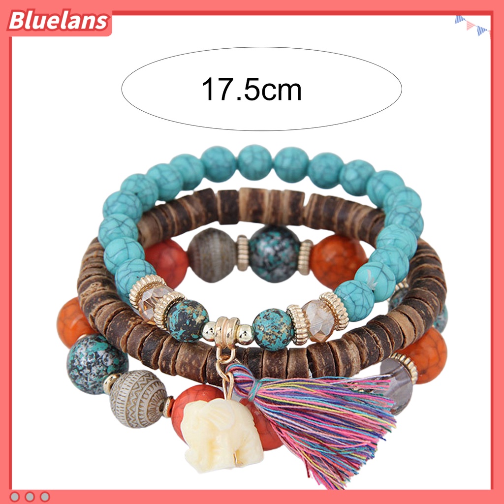[BLS] 3pcs/set Tali Elastis Multilayer Resin Wanita Gelang Wanita Bohemia Gajah Rumbai Manik-Manik Gelang Perhiasan Aksesori