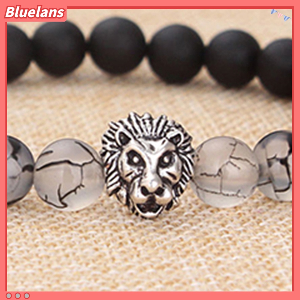 Aksesoris Fashion > Gelang Tangan & Bangle > [BLS] Charm Gelang Elastis Adjustable Frosted Stone Silver Lion Beaded Cuff Bracelet Untuk Pakaian Sehari-Hari