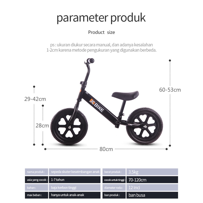 Product Description: 1. Nama Produk : Balance Bike Sepeda anak yang memiliki daya dukung 25 kg 2. Ban polimer EVA yang tahan lama tidak membutuhkan udara 3. Memiliki rangka besi dengan dilas kuat 4. Pegangan mini yang cocok untuk balita