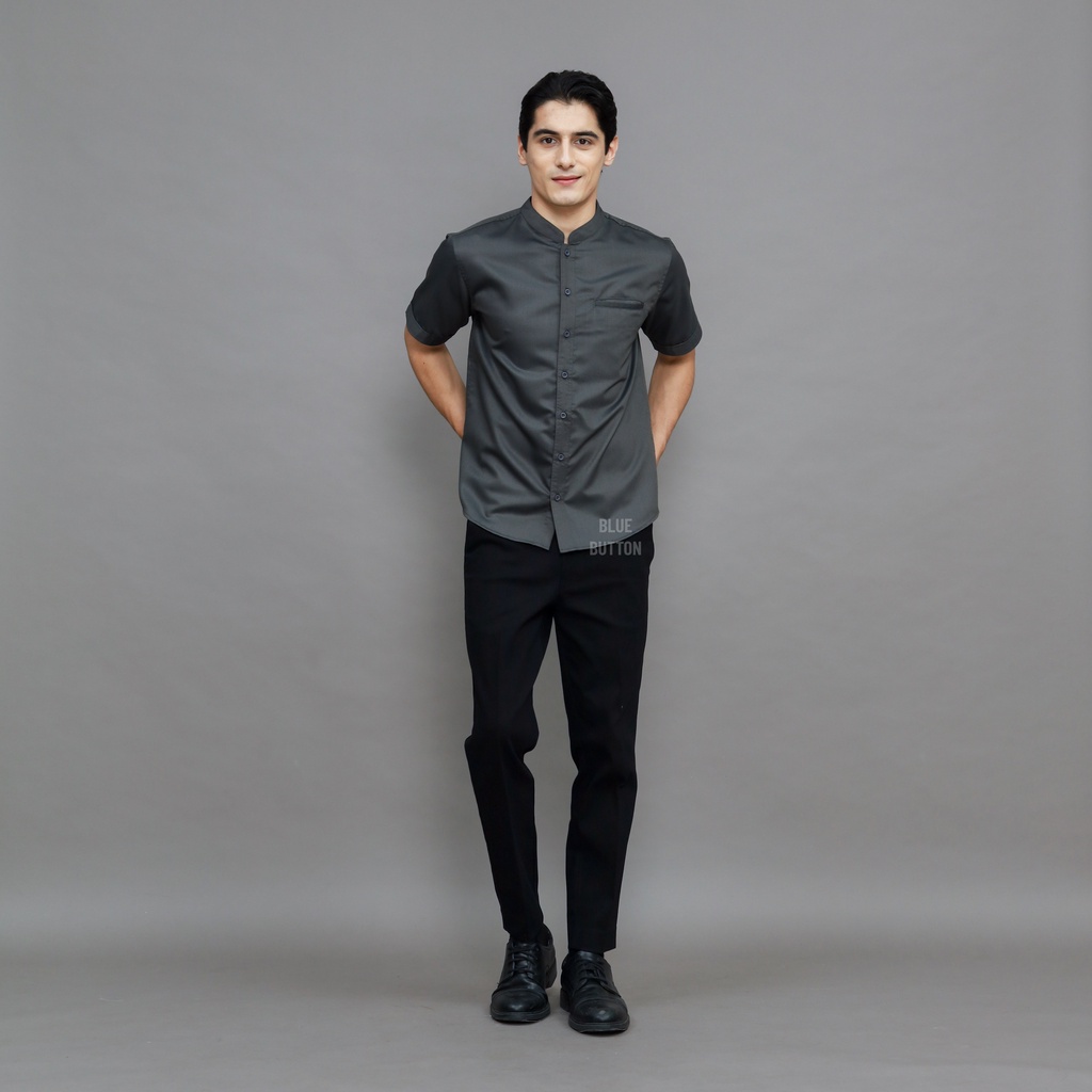 Detail BlueButton Kemeja Koko Polos Lengan Pendek Kerah Shanghai Pria Warna Dark Grey