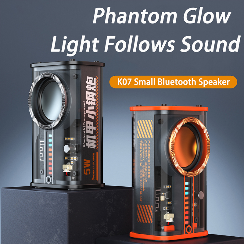 Product Name: Cyberpunk Transparent Mech Bluetooth Speaker Product model: K07 Connection method: Bluetooth connection Battery life: 4 hours (inclusive) - 6 hours (not included) Speaker unit: double speakers Charging input: 5V=0.5A Bluetooth version: V5.0 Battery capacity: 600mAh Maximum power: 5W Transmission distance: about 10m Standby power consumption: 12h Dimensions; length 54.4mm width 41mm height 96.5mm
