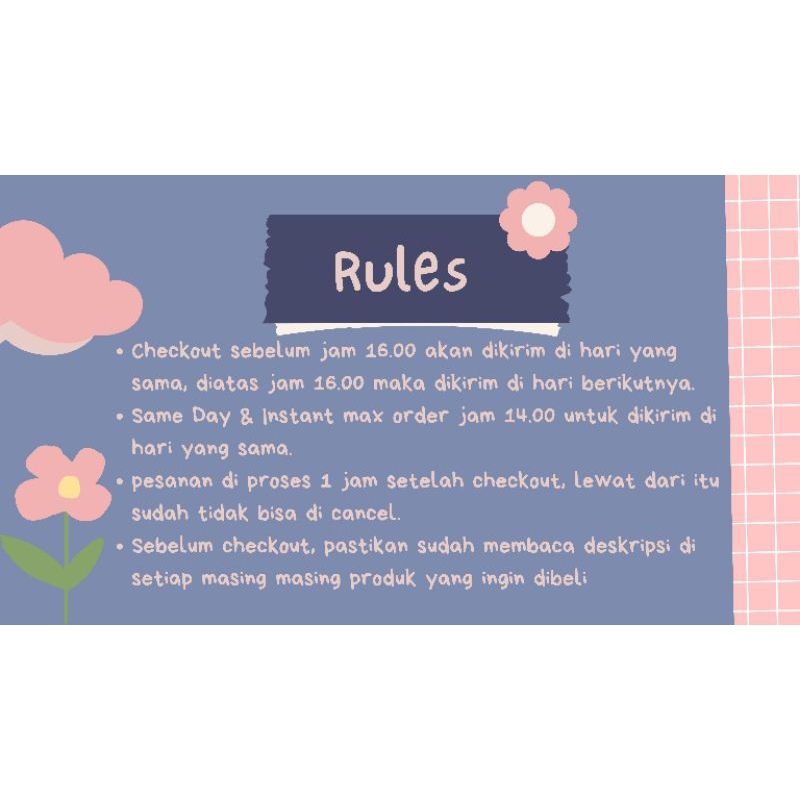 • PASTIKAN PESAN SESUAI DENGAN YANG INGIN DIBELI (KESALAHAN PEMBELI DILUAR TANGGUNG JAWAB KAMI) • TIDAK TERIMA UBAH ALAMAT DAN VARIASI VIA CHAT • COD TIDAK DAPAT DIBATALKAN (KARENA MERUGIKAN PENJUAL) • KOMPLAIN & PENGEMBALIAN BARANG HARUS DISERTAKAN VIDEO UNBOXING • CHECKOUT SEBELUM JAM 16.00 AKAN DIKIRIM DI HARI YANG SAMA, DIATAS JAM 16.00 MAKA DIKIRIM DI HARI BERIKUTNYA • SAME DAY & INSTAN MAX ORDER JAM 14.OO UNTUK DIKIRIM DI HARI YANG SAMA • PESANAN DI PROSES 1 JAM SETELAH CHECKOUT, LEWAT DARI ITU SUDAH TIDAK BISA CANCEL • SEBELUM CHECKOUT PASTIKAN SUDAH MEMBACA DESKRIPSI DI SETIAP MASING-MASING PRODUK YANG INGIN DI BELI