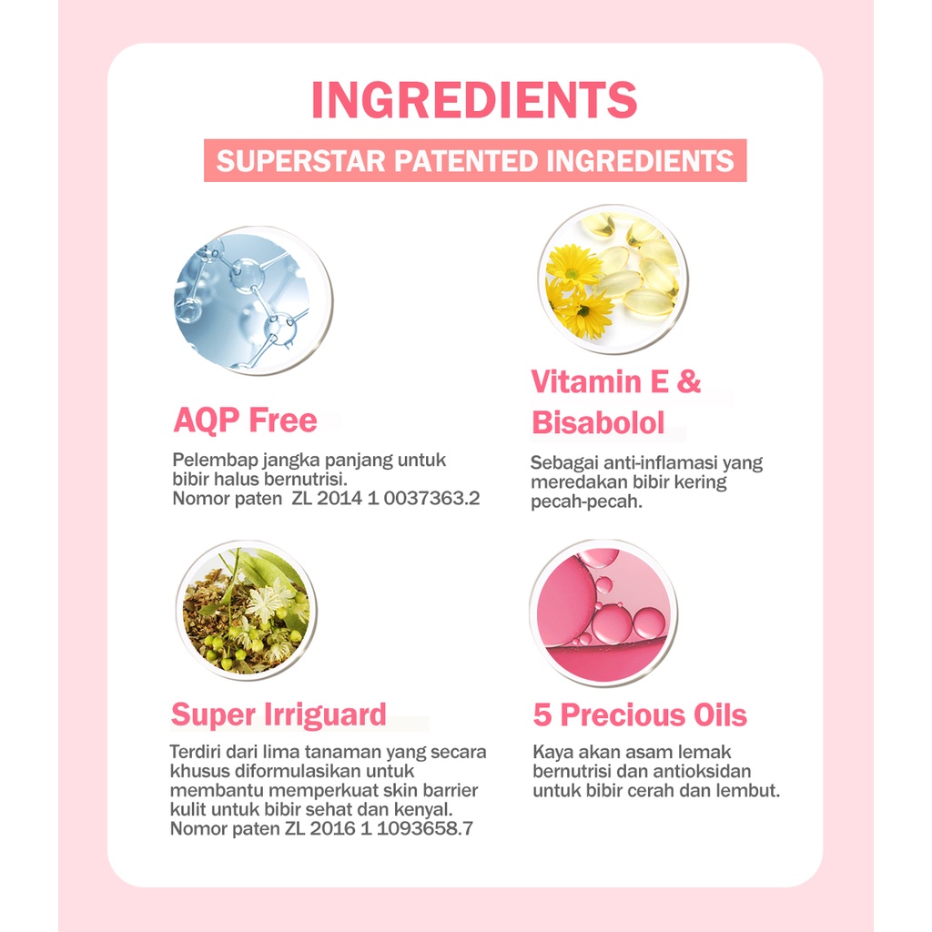 Formula yang dilengkapi dengan 5 jenis oil + Vitamin E dan Bisabolol + 10 ekstrak tanaman yang menutrisi dan melembapkan bibirmu.