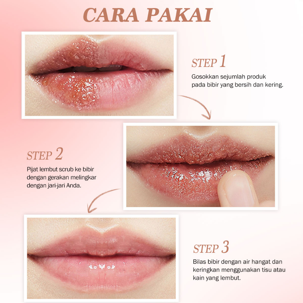 Butiran gula halus yang dengan lembut mengelupaskan sel kulit mati pada bibir tanpa melukai dan menghaluskan tekstur bibir.