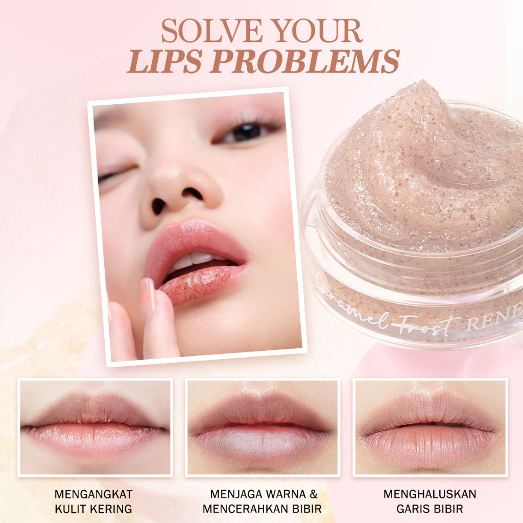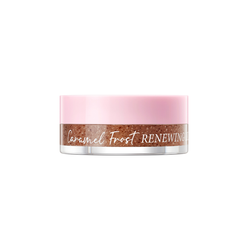 Scrub bibir beraroma karamel yang lembut dengan butiran gula halus, 3 jenis Precious Oils, Squalane, Ceramide, dan Vitamin E untuk bibir yang halus dan lembab.