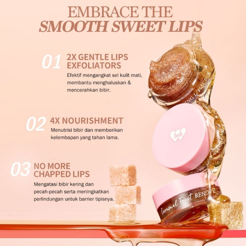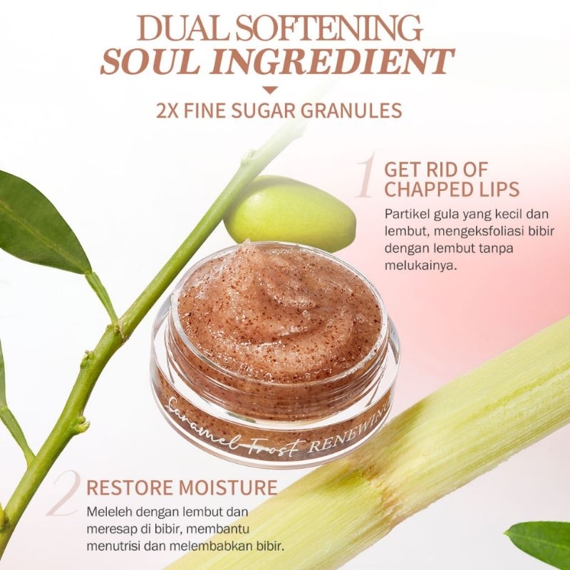 What it is: Scrub bibir beraroma karamel yang lembut dengan butiran gula halus, 3 jenis Precious Oils, Squalane, Ceramide, dan Vitamin E untuk bibir yang halus dan lembab.