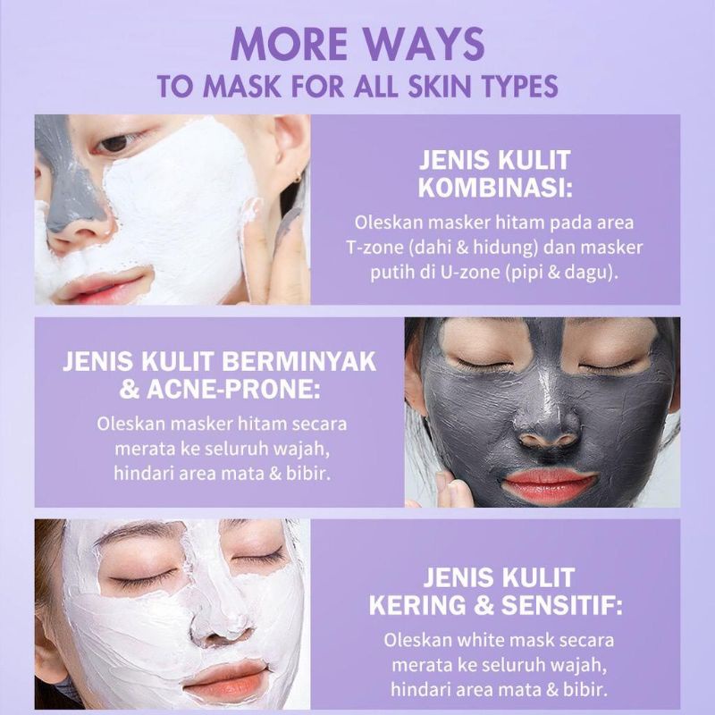 Mengandung 2 jenis clay mask dengan fungsi berbeda, black clay untuk eksfoliasi dan white clay untuk mencerahkan, yang dapat kamu gunakan sesuai dengan kebutuhan kulitmu.