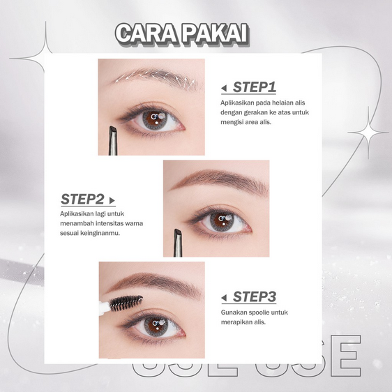 How to use: Aplikasikan pada helaian alis dengan gerakan ke atas untuk mengisi dan memberikan intensitas sesuai keinginanmu, gunakan spoolie untuk merapikan alis.